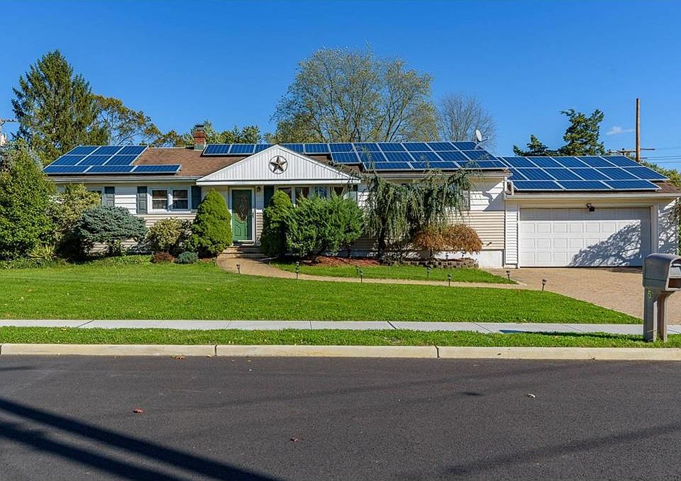 Sprawling expanded ranch with 4 bedrooms and 2 bathrooms situated on corner lot. Formal living room with decorative molding. Formal dining room with French doors leads to backyard. The family room boasts a brick wood-burning fireplace and recessed lighting. Kitchen has pass-through to family room. French doors in family room lead to a relaxing sunroom with panoramic views of the rear yard. Extra-large master bedroom with huge walk-in closet and updated bathroom. 3 bedrooms have HW floors under carpet. The finished basement has an office with large closet, rec room and bar area. Bilco doors provide outside entrance to rear yard. Oversized 2 car garage with work area. New shed in rear yard. Large in-ground pool, hot tub and fenced in yard. Energy saving solar panels are OWNED, not rented!