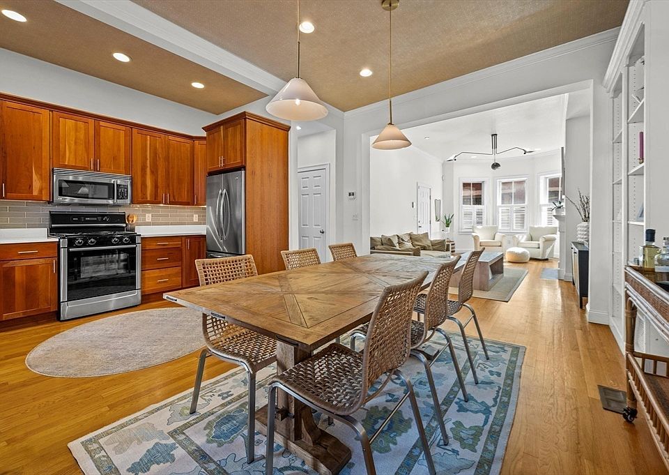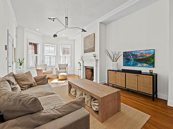Stunning, sun-drenched, designer-inspired showcase brownstone residence! Nestled on a highly sought-after, gas-lit street in Charlestown. Sweeping front to back open living room, kitchen, and dining space, with towering ceilings, a large bow window & custom built-ins! A well-appointed kitchen showcases new marble countertops, tile backsplash, SS appliances & custom cabinetry! Off the kitchen enjoy easy access to a large private patio, perfect for memorable entertaining! The two bedrooms are generous in size, and the primary features beautiful grasscloth wallpaper & large walk-in closet. Additional amenities include; hw floors, central A/C & in-unit laundry! Every detail was meticulously thought out by a prominent designer; from the elegant subtle wallpapered ceilings to the designer lighting & fashionable window treatments. Featured in Southern New England Homes magazine, this exquisite home is one you don't want to miss! Move in ready! Just pack your toothbrush & call it home!