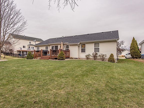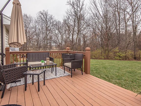 Prepare to be impressed by this ranch style home that has been upgraded with fine finishes. Hand scraped wood floors in the dining room, great room, kitchen, breakfast room, and main floor laundry room.  Vaulted ceilings in the great room and a gas fireplace.  The kitchen is upgraded with 42 in cabinets, quartz counters, stainless appliances, and upgraded backsplash.  Updated light fixtures throughout most of the home and newer carriage style 2 panel doors. Primary bedroom suite with large walk in closet, updated bathroom with double sink, separate tub and shower, newer flooring, and updated fixtures.  Updated hall bathroom and 2nd and 3rd bedrooms on the split side of the house.  Newer door walking out to the deck space. Located on a court this home has a flat backyard that backs to trees and woods.  The lower level is finished with a large rec room and family room areas with bar top, faux electric fireplace, 2 more possible bedrooms or office/exercise rooms, plus bonus storage areas.