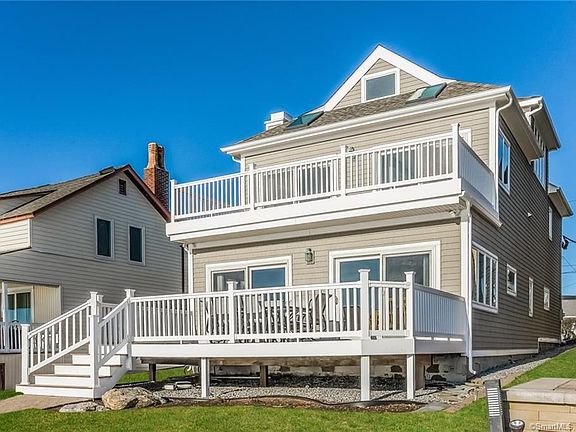 Stunning direct water front where you'll enjoy glorious sunrise & sunsets - No flood insurance required as your sea wall keeps you high & dry. This home has had major improvements including windows, roof, deck, cedar impression vinyl siding, & more. Multi-level living in this light, bright, contemporary open floor plan with each level offering its own unique & unobstructed water views. Inside & out you'll find multiple levels of gathering spots. Nearly 2500 sq. ft. make up this roomy & spacious 3 full baths, 3 bedrooms home. Main level open floor plan with tile floor entry, hardwood floors in living area and oversized sliders that lead to your maintenance free composite deck. Just a few short steps to launch your kayak and enjoy any water activity. Walk up the custom staircase to the 3 generous bedrooms including the primary suite and library. Both the primary bedroom suite & library have private balcony access with breath taking views. Last but not least the third floor bonus room offers a versatility of use. The huge sky lights bring in the warmth & energy that allow you year round happiness. Located within minutes of Clinton town shopping/services, 20 minutes to New Haven/Yale and convenient to NYC/Boston. Now is your chance to simply enjoy year round Inspirational & stress free living on the Sea!