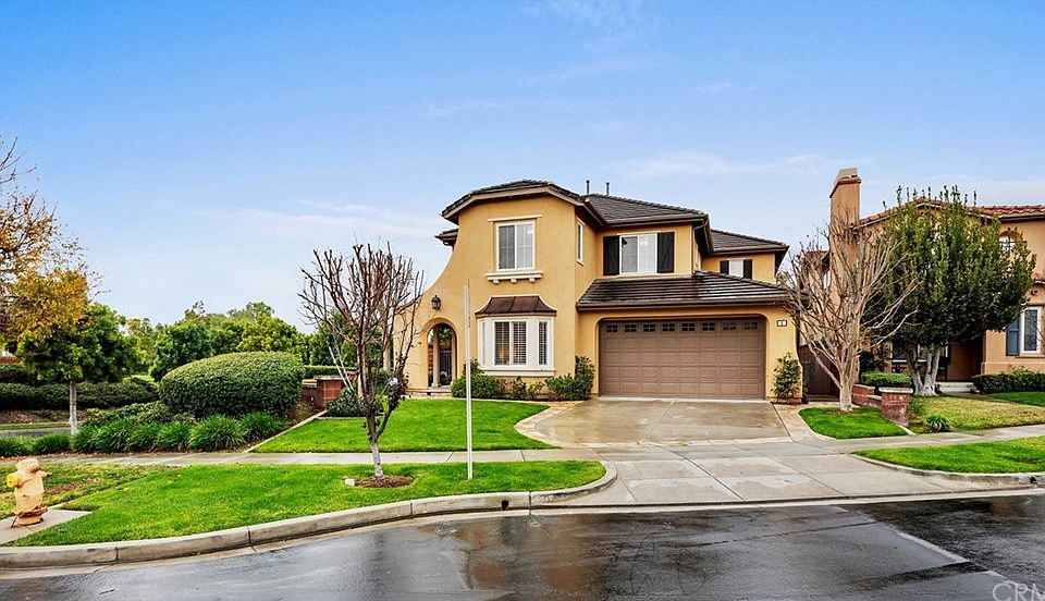 Experience the classic California lifestyle in this beautiful Ladera Ranch home, which offers impressive indoor and outdoor spaces, a cul-de-sac setting and a location near parks and schools. Nestled on a large and exceptionally private corner homesite, the French Chateau-inspired 2-story residence is surrounded by manicured lawns and gardens that complement a stone-finished covered front porch, and rear patios with views of the neighboring park. Approx. 3,100 s.f., the open floorplan displays a formal living room with bay window, a formal dining room with buffet niche, and an open family and kitchen area with fireplace, media niche, backyard access, separate breakfast nook with spacious pantry, an island, white cabinetry, breakfast bar, double ovens and a 5-burner cooktop. Five bedrooms and 3 baths are featured, including a main-floor bedroom that is perfect for in-laws and guests. Plantation shutters, wood floors, crown molding and ceiling fans lend a custom touch throughout, and a laundry room with sink and cabinets enhances convenience. Upstairs, your elegant master suite boasts a private sitting room that would also make a wonderful office or gym, a walk-in closet with mirrored door, and a stylish bath with soaking tub, separate shower, dual sinks, an abundance of cabinetry, and a sit-down vanity. The inviting home is walking distance to Ladera Ranch elementary and middle schools, multiple parks, hiking and biking trails, lighted tennis courts and swimming pools.