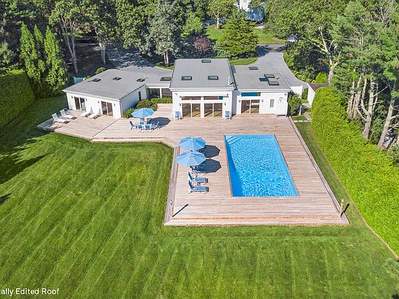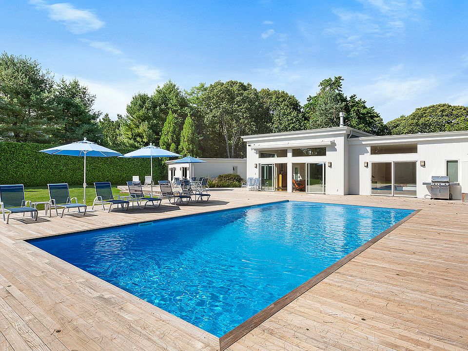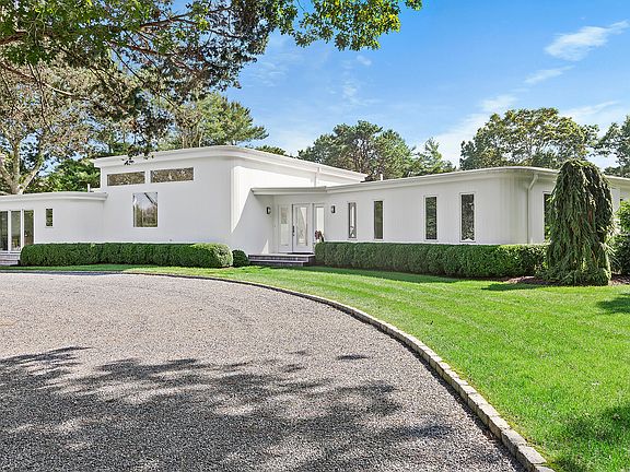 This stunning contemporary resides on a much sought after quiet, country cul-de-sac. Originally built in 1980, the house has been completely custom renovated with top-of-the line upgrades and details throughout. The main living spaces feature double-height ceilings and all open onto the lush grounds. The master bedroom, with dual bathrooms, also opens to the outdoors. Three additional bedrooms, of which one is en suite, located in a separate wing offering privacy. There is a full basement with a gym, and a one-car garage with a studio that can easily be converted back into a 2 car garage if needed. The park-like property is just shy of an acre and hosts a 20x40 heated pool, multiple levels of IPE decking, awning covered spaces and an outdoor shower. The western exposure offers sunset vistas as your backdrop. Summer or year round living in a waterfront community with access to Moriches Bay.