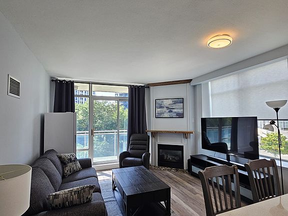 Corner suite condoExpansive windowsPrivate patioNatural lightOpen layoutGas fireplaceModern kitchen