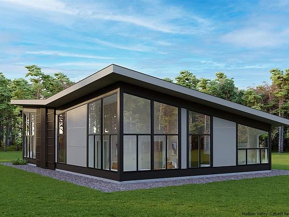 Emperor is an efficient, mid-century modern take on Catskills' country living. Signature to the Mariposa series, the structure features a dynamic butterfly roofline. All 2,334-square-feet of this residence feature impressive scale, volume and character. Upon arrival, enter into an expansive open kitchen, living and dining area. A free-standing double-sided fireplace finished with cement stucco draws attention to the exceptionally high ceilings, emphasizing the ethos of Emperor; natural light and flowing space. Radiant heated floors throughout maintains a cozy feel to the home. Soaring walls of windows blur the lines between inside and out. The generously sized gourmet kitchen features custom hardwood cabinets by Mod, quartzite countertops, backsplash, and an island replete with supplemental storage; ideal for both everyday and occasional entertaining. The bedrooms, which feature hardwood flooring or honed concrete, are optimally positioned opposite the living area, offering maximum privacy and peace. The Master is comprised of a walk-in closet, an elegant ensuite bath that features a 72" soaking tub separated by a glass-enclosed curbless shower and custom double vanity with Grohe polished chrome fixtures. The guest bedrooms are spacious and can be modified to suit your needs. The additional guest bath features a double vanity and a glass partitioned curbless shower; the powder room is located in the open foyer. Finally, a conveniently located laundry room with side-by-side vented washer and dryer. All of our homes include central heat and AC, an HRV system, on demand water heaters, wiring for whole-house speaker systems, low voltage exterior lighting, zoned climate control, radiant heated floors, and customized finish choices such as tile, flooring and siding.