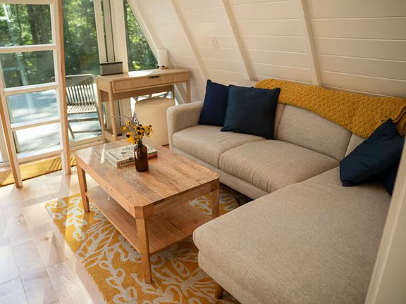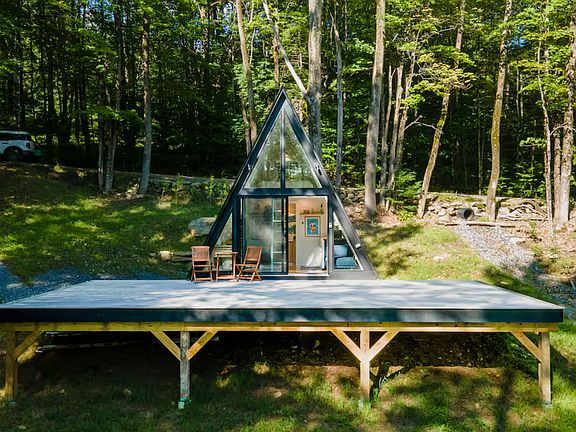 Newly built A-Frame getaway cabin built in the middle of the woods of Vermont. Unplug from it all at this special space surrounded by nature. Enjoy doing yoga and relaxing on the deck, remote working with fiber optic wifi, utilizing the fire pit to roast smores, or taking a walk around the walking paths on the property! There are also nearby hikes, swimming spots, skiing destinations, and drinking/eating spots! The a-frame cabin is a 250 sq. foot open layout plan cabin. The downstairs is one big open room with a private bathroom with shower. Up the wooden ladder, in the loft, is a queen sized bed! This a-frame is located on a 3 acre wooded property with another rental house.