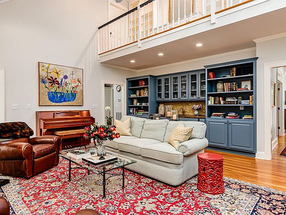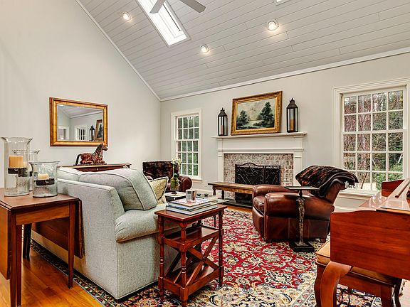 The woodland setting for this rambling, fun filled home offers privacy, plenty of lawn for play and woods with trails for walking from the 5 acre lot. A 2007 total renovation created a 5500 sq ft home with two separate living areas, each fireplace centered, with lofty ceilings, hardwood floors, built in bookcases and loads of charm. The downstairs master is balanced by a large other downstairs, bedroom or workout room. The formal dining and living rooms are functioning perfectly as his and her offices. The spacious family room houses the kitchen, pantry, a back stairway, generous dining space, and living room with stacked stone fireplace flanked by French doors to a covered back porch. 4 BR, 4.2 BA, full guest apt above the 3 car garage, and bonus play space in main house as well.