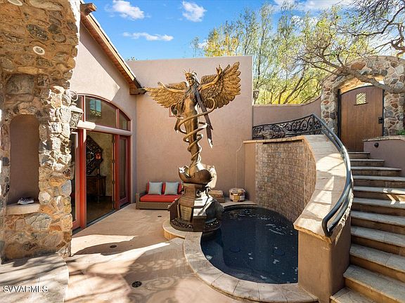 Now Buy! Experience the charm within this authentic Tuscan villa, an architectural masterpiece in the heart of West Sedona. Set above neighboring parcels in tranquility & views of breathtaking Red Rocks. A custom onyx-gated entry leads to a serene courtyard w/ a cascading water feature & circular stairwell. The 4,810 sq. ft. residence includes 3 bedrooms, an office, & 4 baths. The great room boasts floor-to-ceiling windows, a wrap-around deck, & stunning views. Sophisticated details include stone accents, solid wood finishes, & a chef's kitchen filled w/ natural light. Courtyard pool can be heated or used as cold plunge w/ spool technology. The lower level features 2 bedrooms, a family/media room w/ wet bar, a wine cellar, & a bonus room w/ a full kitchen—ideal as a studio or in-law suite The yard offers privacy, firepit, herb garden, & easy a access to trail.