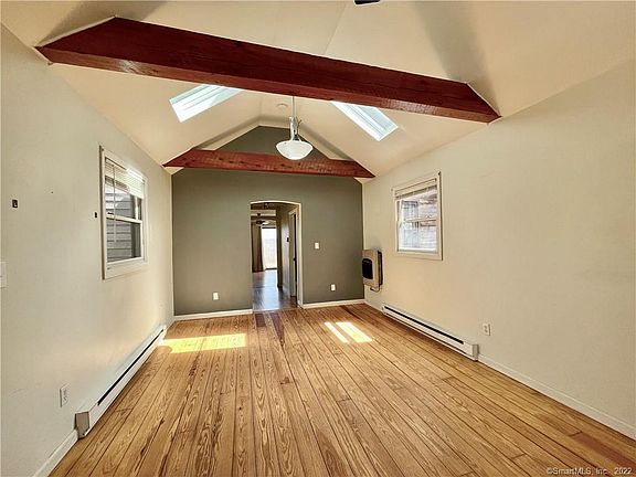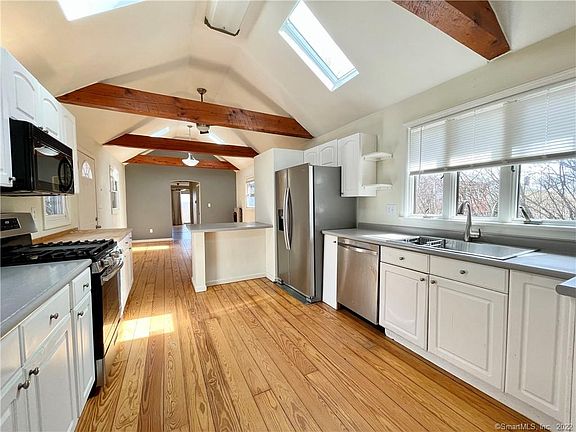 Charming Contemporary Chalet with Private Beach & Boat Slip On Candlewood Lake! Updated kitchen with newer stainless steel appliances, cathedral ceiling with exposed wood beams, skylights and breakfast bar. Light and bright dining room with pantry and newly refinished hardwood floors. Spacious living room with built-in reading nooks, fireplace and access to the expansive decking overlooking the distant mountains. Main level bedroom and laundry. Upstairs offers a spacious bedroom with updated bath, vaulted ceiling and Juliet balcony with amazing sunrise views. Total privacy on the back stone patio with gardens, shed and storage. Newly paved driveway 2020, new roof and gutters 2020 and updated electrical 2020. Also newly stained deck 2019, new septic in 2010 and updated in 2021. Walk to the private community beach and boat slip and enjoy lake living this summer!