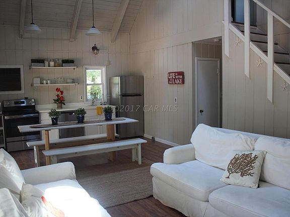 Cute as a button. Open floor plan with great room, dining and kitchen. The kitchen was redone in 2017 with laminate floors and stainless appliances. Skylights and lots of windows keep this area sunny and bright. The first floor has two bedrooms and a bath with a newer vanity and toilet. Upstairs is the master bedroom and bath and walk-in closet. There is plenty of storage in the attic eaves. Outside is a composite deck, shed and outside shower. This house is sold furnished with a few exceptions.
