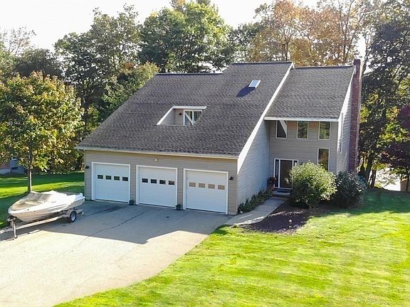 The ultimate haven! Hard to find modern contemporary stunner poised on over 1 acre with 100 feet of water frontage on 120 AC Thompson Pond! This exciting home is big enough for entertaining yet intimate enough for quiet evenings alone. Spacious, light filled rooms with 10' ceilings on the 1st floor and a great floor plan that invites all of your family & friends! Updated kitchen with center island for quick bites has a large dining area & is open to the fireplaced livingroom & formal diningroom. Sliders lead to the expansive deck from these rooms! Hide away in the luxurious mastersuite w/sitting area, gas fireplace,bath w/spa tub & walkin closet ! Two more bedrooms share a full bath & have private balconies! Multiple options to have a home office on every level! Plenty of space for your home gym too! Fantastic, finished, walkout lower level with kitchen & full bath is perfect for an in-law, extended family space! Garage for THREE cars! Superior location! It's a perfect place to unwind!
