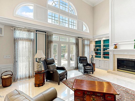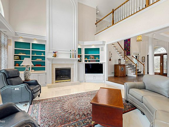As you step through the oak front door, adorned with leaded glass, an open floor plan greets you with 10' ceilings and newer 5'' wide plank engineered flooring, plus custom crown molding throughout. Off the entryway, find a tastefully designed office featuring built-in shelving and cabinetry - an ideal space for productivity. The dining room is distinguished by its dual tray ceiling with accent lighting, setting the stage for memorable meals. The sunken great room, complete with gorgeous porcelain floors and a gas fireplace flanked by built-in bookcases, offers a welcoming ambiance for relaxation or entertaining guests. This room also features ceilings that reach 20' into the air. There is a Crawford Entertainment Surround Sound System, Marantz AM/FM radio & CD Player System with speakers throughout the first floor. Great room tv is also wired in.