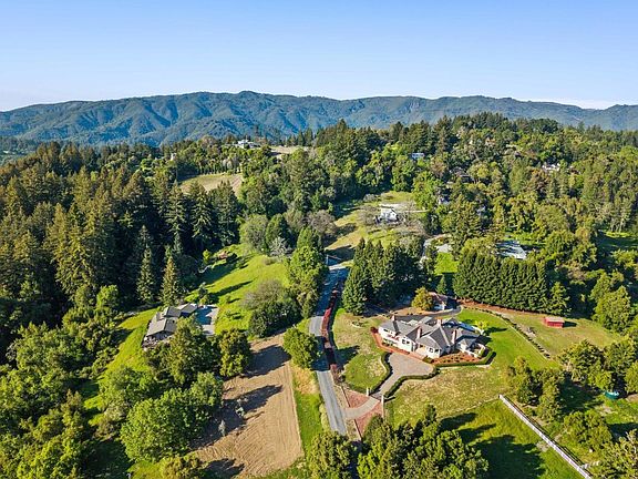 A locally famous dinosaur sculpture park greets you at this exceptional mountain estate, boasting 270 degree panoramic mountain & bay views! Sunny, flat/gently sloped acreage offers an abundance of usable land to add an ADU, orchard, vineyard, horses, sport court, pool etc. The interior centers around a stunning remodeled kitchen with custom cabinetry, gorgeous quartz counters, incorporating breakfast dining, all open to the cozy den with brick fireplace. Oak beams, paneling & moldings showcase custom craftsmanship throughout the home. Separate formal dining & living rooms with panoramic views, flank the grand entry hall. Entertainers will love the recreation room with bar, display cabinetry and shelving for your liquors/glasses. The primary suite features a remodeled oversized stall shower and sunny deck. 2 further beds and full bath in the opposite wing. Attached 2 car garage plus detached garage/workshop with loft. Automatic gates at the main entry with paver driveway, an alternative 'tradesmans entrance' opens to a circular driveway to the back door/laundry room, then exits onto Skyland. Beyond the expansive lush lawn is a natural meadow/pasture. 'The dinosaurs' are a popular, local landmark, much loved by the local mountain community. First time on the market in 4 decades!