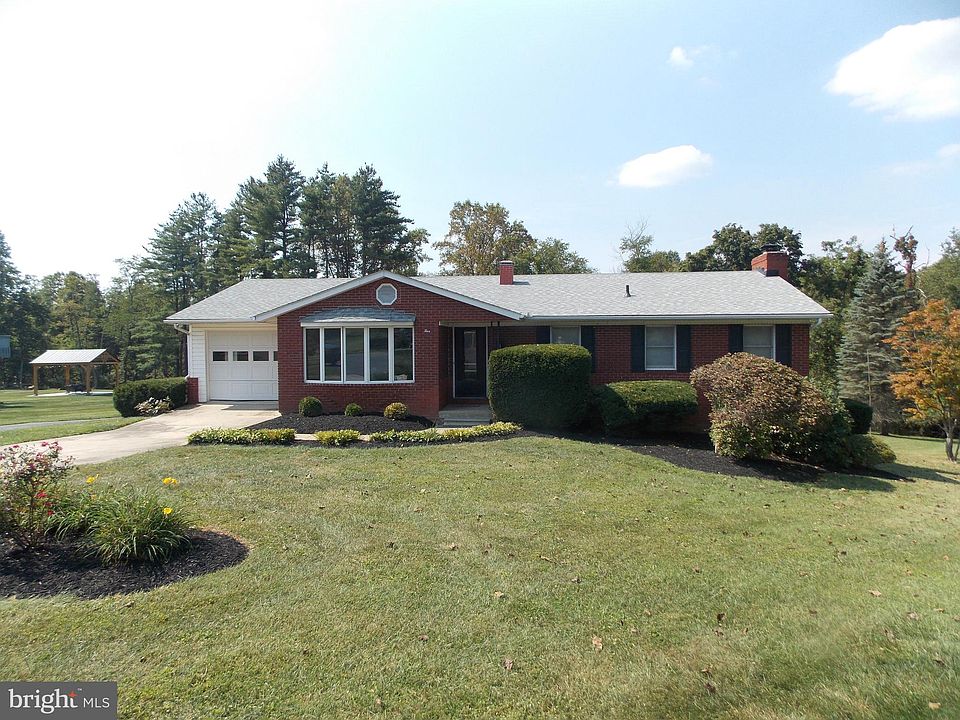 LIST PRICE ADJUSTED TO: $465,000. ***** LARGE & UNIQUE custom-built mostly brick rancher situated on 3/4 acre facing large court off quiet cul-de-sac minutes from Westminster, Sykesville, Rte 70. This home is remarkable for the interior vintage adornments celebrating the most dynamic colors of the 1970s. Standout features on the 1st floor are large hall bathroom with full-length dressing area and attractive family room addition with full-wall stone wood-burning fireplace and trey ceiling with recessed lighting. Both 1st floor bedrooms have hardwood; the primary BR includes private bathroom and walk-in closet. Formal dining room (with multi-faceted glass chandelier and wall sconces) is off the kitchen between the living room (with large bay window) and the family room. The kitchen is either "dated" with Brady Bunch colors or a beautiful retro time capsule space. ** You enter the "fun zone" as you descend red shag-carpeted stairs embraced by red-flocked textured walls to the lower level entertainment and living area featuring a 10 foot Naugahyde wet bar (serving 8 bar-stools), and full-wall brick wood-burning fireplace. The "barroom" spaciously accommodates large gatherings, has the convenience of a powder room right out of the 1970s and a sliding glass door walk-out onto an 18x18 backyard patio. Off a short hallway from the "barroom" there is a private large sunlit carpeted bedroom (or bonus living room) with built-in shelves/cabinets, Polk wall speakers, recessed lighting and backyard walk-out access. Moving along the lower level you find a spacious sunlit laundry room with washer/dryer, cabinets, counter-tops and ample closet space. In this area there is a recessed freezer and a recessed refrigerator. Next to this area is a 90 sf finished storage room. ** This Carroll Park property includes a HUGE 1,248 sf 4 vehicle-bay garage/workshop built in 1991 with 12" block and 5" concrete floor. Garage has electric service, water and phone and a separate driveway. The Carroll Park neighborhood is very nice and all homes are well-maintained; there is no HOA. Roof is new 2022. Septic has been regularly pumped every 2 years. Hot water heater new in 2015. Electric Stove/Oven new in 2021. The 1991 family room addition on 1st floor has door that accesses the "yet to be built" deck. Home has a deep, 11x26 foot attached garage with kitchen access. USDA available. CINCH HOME WARRANTY ENROLLED.