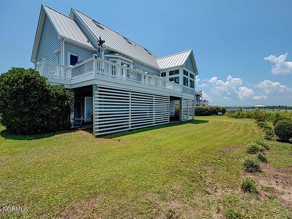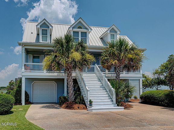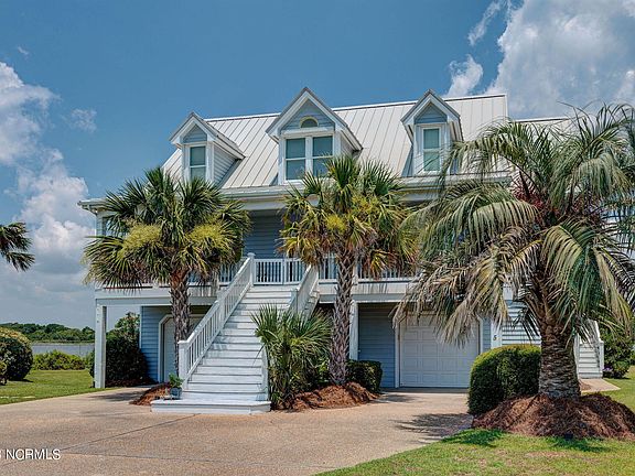 Breathtaking views of the intracoastal waterway, wildlife sightings, distant ocean sounds and beautiful mature palm trees will instantly welcome you home to 5 Osprey Circle. This waterfront home is within the gorgeous Osprey Community on North Topsail Beach, NC. Watch the sun rise from the front porch every morning and then enjoy the famous NC sunsets from the back deck, living room, sunroom, and kitchen! Upon entry into the foyer, you will immediately see the intracoastal waterway through the sliding glass doors in the living room. Stay cozy in winter and entertain around the gas fireplace while enjoying the sweeping views. The kitchen was recently updated with stunning Corian countertops, new appliances, and a beautiful tile backsplash. This kitchen has a plethora of cabinets, counter space, island, and a wet bar, plus room for a full-size dining room table. Enjoy the views through the large bay window with a built-in window seat! A separate laundry room is located off the kitchen along with an additional den/office space. The primary bedroom and ensuite bathroom are also on the primary level with an enclosed sunroom facing the water with access to the back deck. Upstairs you will find 2 additional bedrooms, a full bathroom, another den/flex space, a walk-in attic, and skylights. Access the spacious 2 car garage from within the home which has plenty of space for cars, kayaks, a golf cart, and it has a workshop area. Entertain in the backyard, wash off from the beach in the outdoor shower or clean off your day's catch in the outdoor sink. This community has a community pier with day boat slips and the potential to apply for a personal boat slip if available. Public beach access is located at the end of Osprey Drive and across the street. This home has it all with views, sits on a little over a half-acre of land, a long driveway and beautiful landscaping. Call today to see this gorgeous waterfront home, then make it your own paradise.