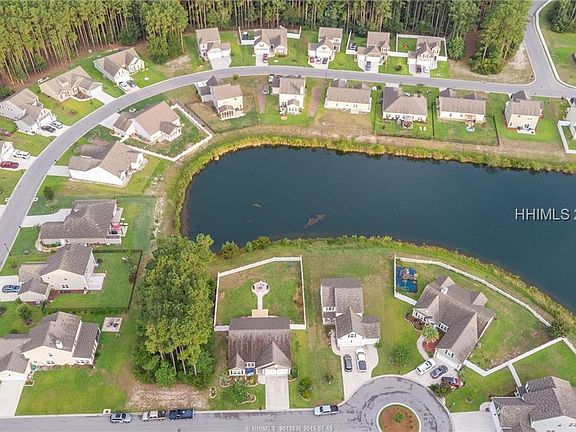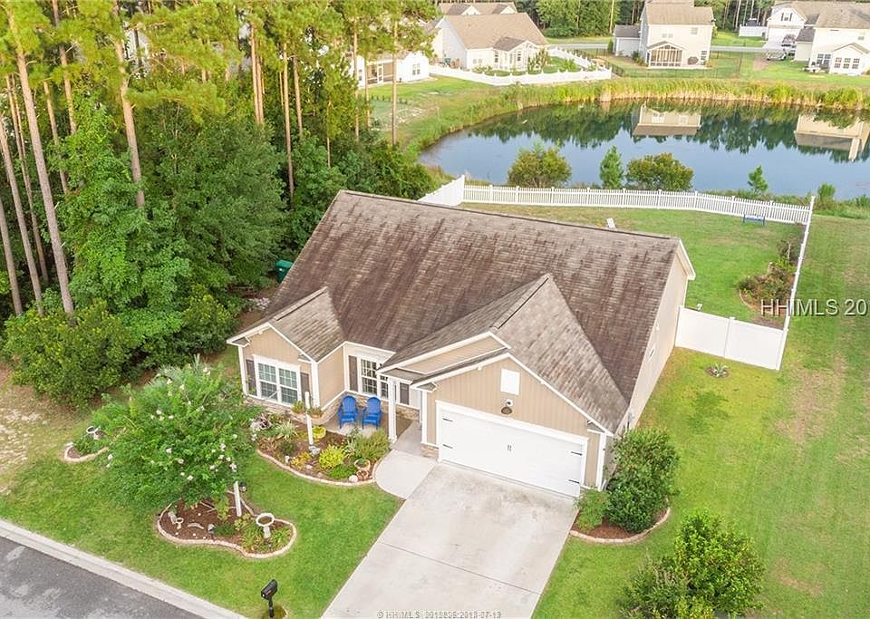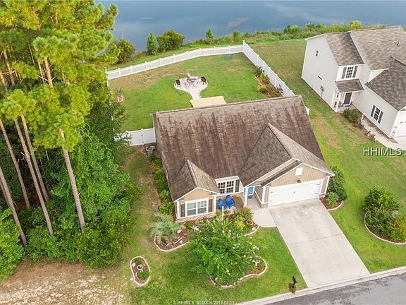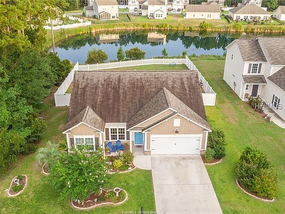 Welcome home! This one-level 4 BED / 2 BATH 1580 SQFT Marina Del Rey model home is in a private-cul-de-sac and on a spacious almost 1/4-acre corner lagoon homesite with a fenced backyard built in 2015 by Village Park Homes in The Meadows at New Riverside community of Bluffton. Exceptional opportunity for an extremely secluded homesite with a neighbor on only one side and lots of backyard space overlooking a beautiful lagoon! This house features front stone accents, granite counters, vaulted ceilings in the living room and owner's suite, a pergola w/ rear extended patio and more. Community amenities include a pool and basketball court.