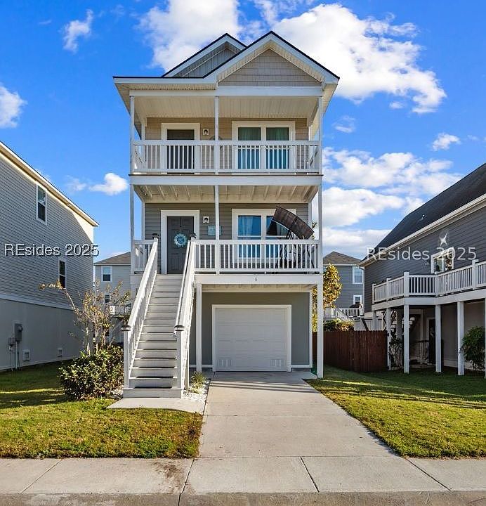 This elevated beach cottage exudes Charleston-style charm, featuring 3 porches (2 are covered), detailed trim work, and coastal curb appeal. Inside, the kitchen shines with beautiful cabinetry, granite countertops, and, stainless steel appliances, including a range, microwave, and dishwasher.All bedrooms are located on the 2nd floor with the primary suite offering a private bath w/dual vanities, a walk-in closet, and a private covered porch overlooking the picturesque community of Palmetto Place. Additional highlights include a one-car garage and unfinished bonus space or "man room", providing flexible options for storage or future expansion. Just a short drive to pristine Hunting Island Beach, this home makes a perfect primary residence, vacation retreat or investment property.