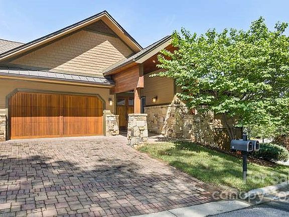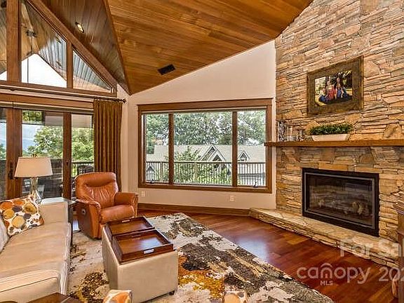 This Reynolds Mountain prestige community townhome is on the highest street in The Views, so has wonderful year-round mountain views and is in pristine condition!! This unit is freshly painted throughout in a warm neutral palette and move-in ready! Brazilian cherry floors throughout main floor and in lower level family room. Primary and laundry on main with two lower level en suite bedrooms. Kitchen has all Viking appliances with pantry and abundant storage space. Gas fireplace and grill on rear main deck; wooden plantation shutters throughout. Home conveys with 5 televisions; large screen projector system in media room, extensive AV control equipment. With tongue and groove vaulted ceilings, a gas fireplace with stone surround, and abundant windows with automatic Hunter Douglas shades, this home epitomizes the lock-and-leave mountain lifestyle -- all within 10 minutes of downtown Asheville!