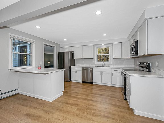 Nestled on a private acre lot abutting conservation land, this stunning home in a premier neighborhood offers modern upgrades and unbeatable privacy. Fully updated within the past two years, it features new flooring throughout, fresh paint, updated cabinets, stainless steel appliances, and stylish vanities. The inviting family room welcomes you off the driveway, while an open-concept kitchen and dining area make entertaining a breeze. The massive deck extends the living space outdoors, surrounded by mature landscaping and peaceful tree coverage. A 1st-floor office/flex room and convenient laundry add functionality. Enjoy cozy evenings in the additional living room with a propane fireplace. The primary suite boasts a walk-in closet and updated ¾ bath, complemented by two more well-appointed bedrooms. The unfinished basement provides ample storage and room to expand. With easy access to Rt. 3 and 93, this home is the perfect blend of convenience and tranquility. Schedule your showing today!