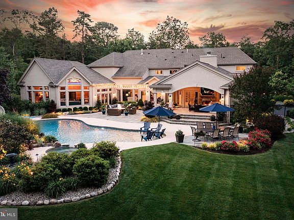 A spectacular custom-built Colonial on 2.25 manicured acres offers a resort-caliber pool, outdoor kitchen and fireside covered bluestone patio with motorized screens. Finished in real Pennsylvania quarry stone and stucco, the circular drive approach reveals classic architectural lines punctuated with a stately portico entry illuminated by a chandelier. This impressive introduction opens to a tray ceiling foyer warmed by the glow of a marble surround fireplace. A well-designed layout measuring 6,158 square-feet offers five bedrooms, four-and-one-half baths and an oversized three-car garage. Highlights of the open floor plan include solid Brazilian cherry floors, detailed moldings, recessed lights, accent walls of stone and brick, a mix of tray, cathedral, two-story and beamed ceilings, Andersen 400 Series windows throughout, plus 2,100 square-feet of additional living space in the professionally finished basement. Sophisticated gathering spaces span from the welcoming foyer, providing ideal venues for entertaining in the upgraded game room with built-in bar area, stylish chef’s center island kitchen, formal living and dining rooms, butler’s pantry and fireside family room. Two home offices are ideal for remote work. Privately situated upstairs, the chic primary suite contains a tray ceiling bedroom with shiplap details, dual walk-in closets and a spa-inspired bath. Spacious secondary bedrooms and upgraded baths as well as a convenient laundry room with stairs to the attic complete the second level. Using the same design aesthetic and attention to detail as the rest of the home, a finished basement contains generously-sized areas for billiards, video gaming and exercise, an elaborate home theater, plus wine storage and a fully-equipped bar area. An enclosed patio with outdoor kitchen, wood-burning fireplace and built-in TV cabinet overlooks the custom-built gunite pool with boulder walls, stone slide, waterfall, spa and seating sun shelf. An entertainer’s dream in Medford Township, this premier Colonial is served by state-of-the-art mechanical systems, including a whole house Generac natural gas backup generator. Originally built in 2010, a variety of updates and upgrades were made in recent years throughout the exceptionally well-maintained residence. Truly a rare offering, its commuter-friendly location is about 20 miles from Philadelphia and is just minutes from the NJ Turnpike.