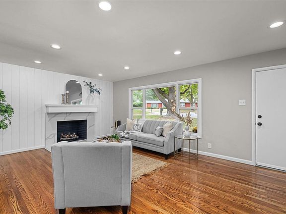 Welcome to this beautifully renovated brick ranch on a quiet cul-de-sac in Olivette! New landscaping, mature trees, and a rear-entry garage make for great curb appeal! You'll love the open layout of the main living area, featuring a shiplap accent wall, marble-surround fireplace, gleaming hardwoods that continue throughout, and recessed lighting. The kitchen boasts quartz counters, stainless appliances, 42" cabinets w/crown molding, and stylish gold fixtures. Step down to the spacious family room w/brick surround fireplace. The primary suite is a retreat w/walk-in closet, step-in tile-surround shower, marble vanity and black fixtures. Two more bedrooms and another full bath complete the space. The finished LL adds a rec room, 4th bedroom, full bath, and room for storage. Enjoy fall on the large patio overlooking the level backyard and shaded by trees. Walking distance to Stacy Park and Old Bonhomme Elementary, moments to all the restaurants and shopping on Olive. Don't miss out!