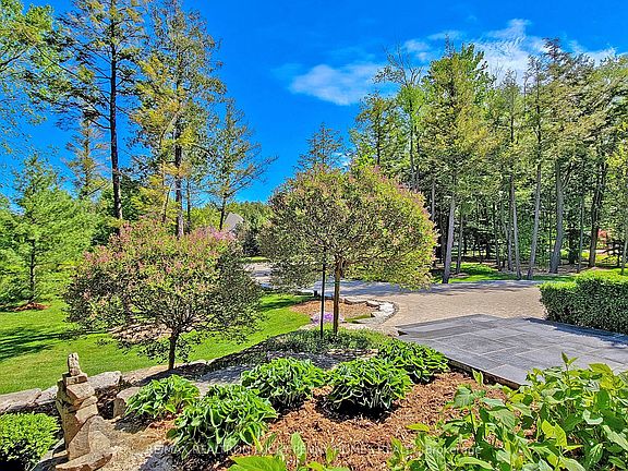 The Ultimate Entertainer's Dream Home! This one-of-a-kind luxury bungalow offers approximately 3,200 sq ft per level of refined living space on a 2-acre private treed lot in a quiet cul-de-sac, backing onto a serene 20-acre parcel with a km walking trail loop.Step inside to discover a bright, open-concept main floor with 10-foot ceilings, elegant crown moulding, and hardwood and tile floors throughout. The family room features a gas fireplace, built-in shelving, and walkout to the deck, seamlessly connecting to a gourmet kitchen with stainless steel appliances, centre island, and tile flooring. Adjacent breakfast area also walks out to the deck, overlooking the resort-style backyard. The formal dining room offers a gas fireplace and bay window, perfect for gatherings.The primary bedroom suite includes a gas fireplace, walk-in closet, and walkout to the deck, while two additional main-floor bedrooms share a semi-ensuite and feature hardwood floors and large windows. A private office with crown moulding and large window provides a perfect workspace.The professionally finished walkout basement boasts heated floors, 10-foot ceilings, and a spacious Great Room with wet bar, gas fireplace, and walkout to the patio. Additional features include two more bedrooms, an exercise room, and ample storage space-ideal for guests or multi-generational living. Step outside to your backyard oasis featuring an in-ground pool, cabana, and multiple seating areas surrounded by mature trees, creating the ultimate resort experience. The backyard also includes a treehouse and a dog free run fenced area, offering both adventure and freedom for family and pets alike.