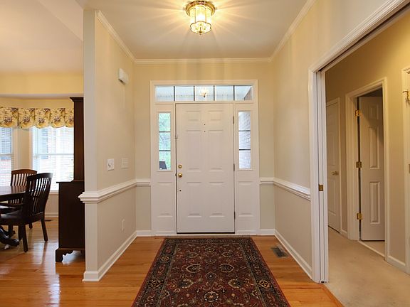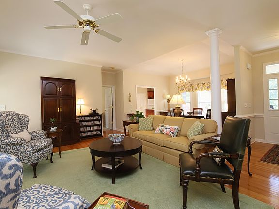 Gleaming hardwood floors, light filled rooms and impeccable, timeless details welcome you. The centerpiece of the home is the open living/dining room featuring a marble surround fireplace and an elegant mantel with dental moulding trim. An integral yet well defined space, the dining area includes a tray ceiling and large bay window. The huge eat in kitchen has rich cherry cabinets, Corian countertops, tile flooring, recessed lighting, crown moulding and beadboard trim. This split floor plan includes a large master bedroom en suite with walk in closet. Pocket doors can be used to separate the two additional bedrooms plus a hall bath. Outside you will find beautiful landscaping and a peaceful patio with lovely brick pillars and wrought iron railings. A wonderful home for entertaining.Large laundry room is adjacent to the kitchen and includes a deep sink. Attached two car garage.
