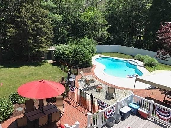 Welcome to Hingham! Spacious Colonial privately located on a picturesque cul-de-sac in South Hingham. First floor features versatile and open spaces with great flow for entertaining, living room that opens to the deck, dining area with fireplace, separate home office, and a master bath and bedroom which could serve as a first floor master, guest bedroom, or a great in-law suite with its adjoining kitchenette. Large kitchen with granite countertops, Thermador range with indoor grill, wall oven, and stainless appliances opens to a dining area with a wetbar. Upstairs you'll find 4 generous bedrooms including a lovely master with a vaulted ceiling, dressing area and second home office space, French doors opening onto a private deck. A bright spacious master bath with skylights and a spa tub completes this space. Enjoy your stay at home vacation fun in the fenced backyard with deck, patio, and fabulous inground pool! Solar panels, storage & all conveniently located to Rt 3 and Derby St.