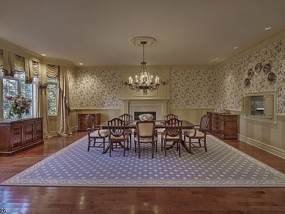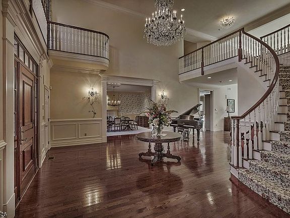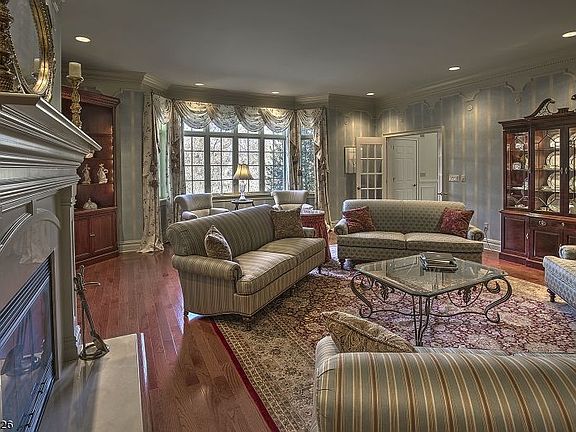 Here is an opportunity to live amid serene privacy in one of Mendham’s most-coveted neighborhoods. A classic yet custom design is perfect for discerning buyers. This English country manor was built by locally-renowned Barba builders in 2003. Beautifully situated atop a 10 acre lot with mature professional landscaping and deer fencing, this property offers luxury living and sheltered privacy. This sophisticated home was designed with high-end materials and features including a mahogany entry door, custom millwork and cabinetry, a stone facade, durable imitation slate roofing, bluestone terraces, hardwood flooring, radiant-heated floors and more. An open double height foyer with crystal chandelier and wall sconces lends a sense of grandeur to the entrance. The handsomely-appointed family room is anchored by a floor-to-ceiling stone wood-burning fireplace. The floor-to-ceiling French doors and Palladian window in the great room provide a flood of warm natural light and views of the professionally-landscaped grounds. Every imaginable amenity graces the chef's kitchen. This gourmet kitchen is adorned with custom cabinetry, granite countertops and professional grade stainless steel appliances. There are three Viking ovens offering six burners a griddle and grill, two Asko dishwashers, two Franke sinks, a Viking warming drawer and warming lights for the kitchen to dining room pass-through. Special occasions take on extra significance in the large formal living and dining rooms, both appointed with custom moldings and fireplaces. The formal library provides a stately atmosphere for a home office, appointed with custom cabinetry, bookcases, coffered ceilings, a rolling wooden ladder and fireplace. Some of the most enjoyable spaces in this home are the game room and indoor pool. The game room is furnished with full bar, pool table and leisure areas with flat screen tv. The indoor pool with vaulted ceiling and picture windows offers a waterfall, spa, radiant-heated floors and a steam shower. The sweeping main staircase leads to a generously-sized master bedroom suite. It offers a sitting room with gas fireplace, wood cabinetry and balcony overlooking the backyard. Opulent appointments include a marble master bathroom with double sinks, jetted tub, separate water closet, dressing area with marble countertop and sink, and two spacious walk-in closets. The master suite also has private access to the indoor pool. Completing the second floor are five additional bedrooms, four full baths, a laundry room and rear staircase to the first floor mudroom area. There is an in-law suite offering a bedroom, full bath, kitchenette and private entrance from the kitchen. Extensively landscaped, this privately-situated property includes a lighted tennis court, putting green and bluestone patio with built-in gas grill for hours of leisure activities. Morris County’s Mendham is conveniently located just minutes from several major highways and about 35 miles from Newark Liberty International Airport.