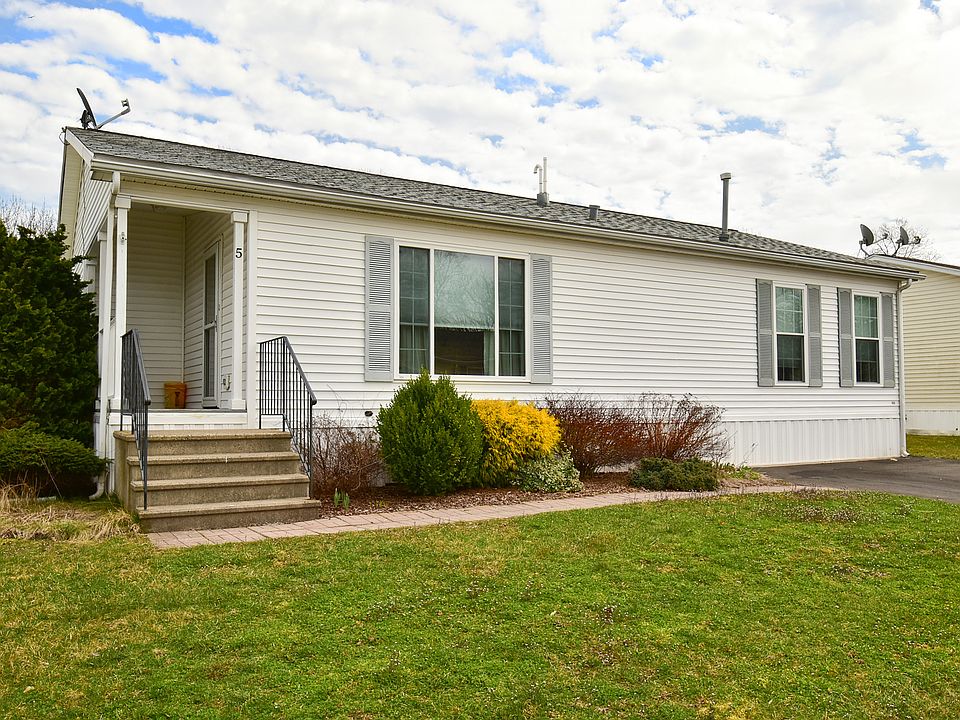Bright & Sunny affordable 2 bedroom, 2 bath Ranch at Laurel View Estates! Great open layout features a large living room with vaulted ceiling, picture window, and wall to wall carpeting. Spacious formal dining room with wall-to-wall carpeting, vaulted ceiling, and new sliders to new 14x12 Trex deck. Open kitchen with breakfast bar. Primary bedroom includes full bath with new walk-in shower, new vanity with double sink, new toilet, and new laminate floor. 2nd full bath with new skylight, and new vanity and toilet. First floor laundry. Newer heating and cooling, and newer roof 2018. Newly paved driveway 3 years old. Updated windows and doors. 6x8 storage shed. Home is on leased land which will be $515. per month, which includes maintenance of the road and snow removal of the road. Homeowner maintains yard and driveway. Must be owner occupied with no rentals. The buyer must apply for land lease with management company. Financing for home is limited to manufactured/mobile home financing, of which River Bank Federal Credit Union, or Priority Funding have loan options.