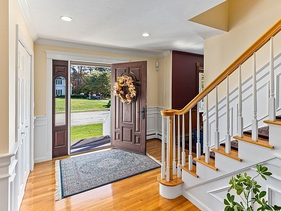 Spectacular 4 bedroom, 3 full bath colonial with wraparound farmers porch in highly desired Sweet Meadow neighborhood nestled on a corner lot of a cul-de-sac. This elegant home has many custom features and quality detail. First floor boasts an open floor plan including a bright custom kitchen with huge island, granite counter tops, beautiful back splash with pot filler and stainless steel appliances. The spacious vaulted family room has gorgeous mahogany hardwood floors and large granite fireplace that leads to a sunny four season sunroom with skylights, ceiling fan and many windows. Generous formal dining room with built-in corner cabinet, wainscoting and crown molding throughout. Stunning library with impressive built-ins and Brazliancherry hardwood floors. Second floor primary suite has lofted ceiling, full bath with laundry room attached, walk-in closet and bonus workout room. Large finished basement with tile flooring and wine/wet bar great for entertaining and ample storage.