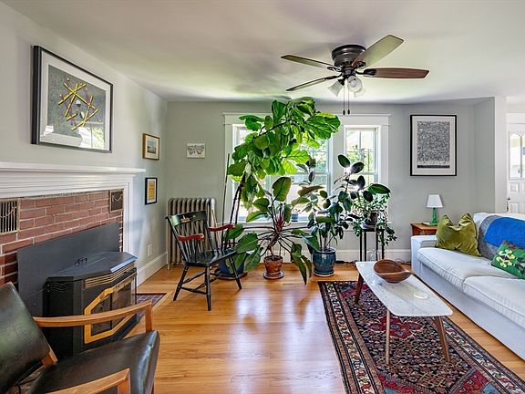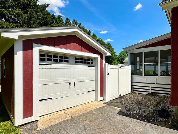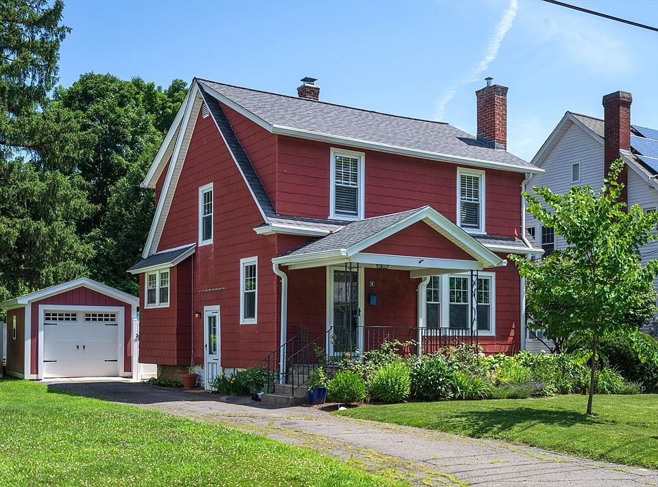Beautifully renovated Easthampton home with detached garage in a peaceful neighborhood walkable to downtown. New roof, gutters, landscaping, insulation. A covered front porch leads into an open concept main level featuring a bright remodeled kitchen with gorgeous counters, white cabinetry, recessed lights, stainless appliances, water filter system; dining room with warm wood flooring and a living room graced with a brick fireplace. Upstairs offers a generous main bedroom, nice-sized 2nd bedroom and stylishly renovated bathroom with modern tile flooring, double vanity, new lighting/fixtures + a deep tub. Off the dining room is a lovely screened porch overlooking a fully fenced, private backyard framed with perennials. Refurbished garage has newer roof, supports, siding, overhead door and is wired for electrical. More updates include electrical, plumbing, fixtures, lighting, ext. doors, windows, boiler (2015), drywall, trim & paint. Highest & best offers requested by 1:00 pm Wed 7/17.