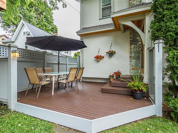 BRIGHTON GEM! Discover timeless elegance and modern convenience in this stunning Tudor-style home, featuring a home office with a private entrance. Boasting 4 bedrooms, 2 full and 2 half baths, this carefully maintained home offers a classic stucco exterior (painted 2023) paired with an array of enchanting 1920s details including arched openings, leaded glass windows, and beautiful hardwood floors. The eat-in kitchen is complete with stainless steel appliances, and opens onto a charming private deck. The cozy living room, with its marble gas fireplace flanked by built-ins, is ideal for relaxing evenings. Work from home effortlessly in the finished lower level, zoned for a home office, or retreat to the third-floor suite, fully remodeled with a full bathroom. Additional perks include a heated workshop in the garage, central air, a direct vent hot water heater (8 years old), and a tear-off roof 9-10 years old. Located near Brighton schools, the library, and pool; Cobbs Hill Park; and 12 Corners; plus with easy access to Strong, the U of R, and highways. This home harmonizes vintage charm with the essentials for modern living. Square footage per seller and includes third floor.