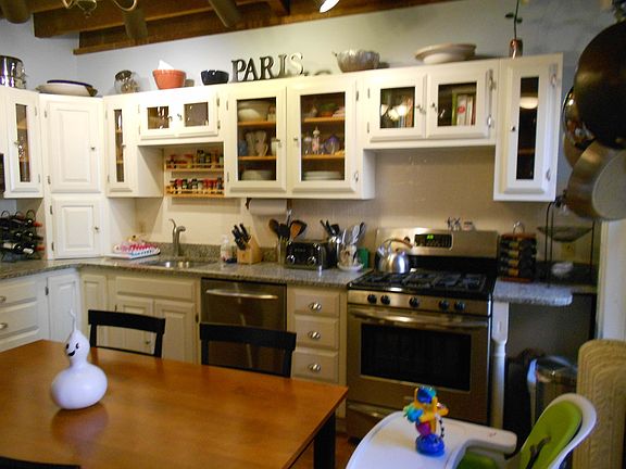 - Kit Dscrp: Pantry, Flooring - Wood, Countertops - Stone/Granite/Solid, Kitchen Island, Stainless Steel Appliances, Ceiling - Beamed, Remodeled, Gas Stove, Lighting - Pendant