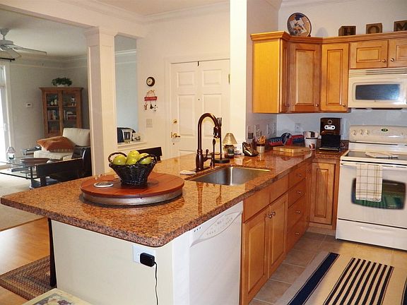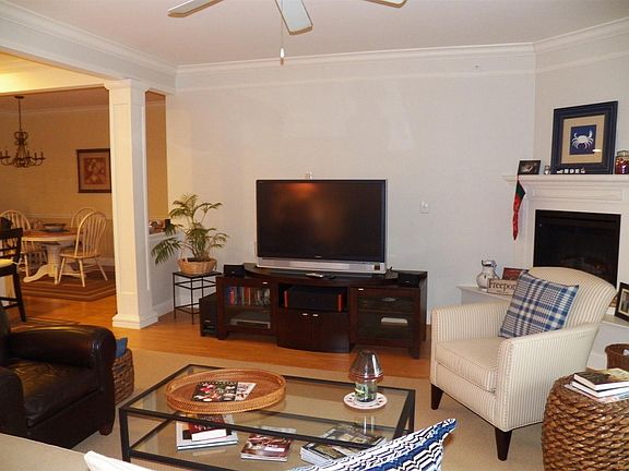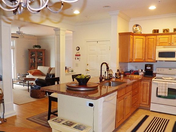 This is a top floor, end unit in bldg #3 in the desirable Condos at Meadowbrook. It is tastefully decorated in custom colors with custom window treatments. The open concept floor plan is great for entertaining. It boasts 9 ft ceilings, crown moldings, granite counter tops, hardwood floors, a corner fireplace, a master bedroom with a master bath w/ separate shower and soaking tub, central A/C, a private balcony, a heated parking garage with elevator access to your 4th floor unit. Enjoy all the social amenities of an over 55 development including the exercise room, a billiards room and library in the club house. Come take a peek and see for yourself.