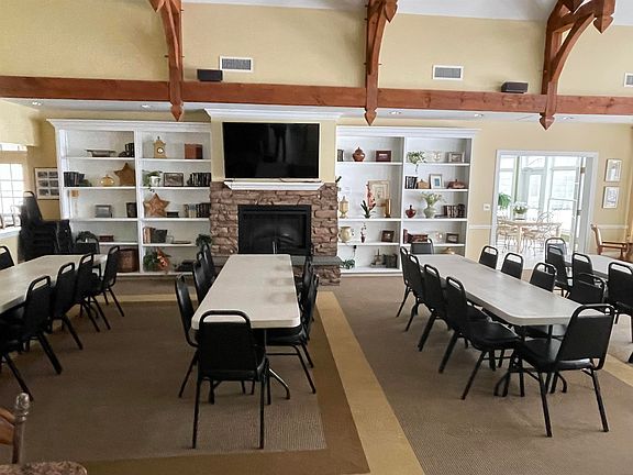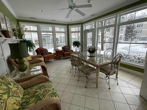 55+ Garden Style Condo with elevator access Home features 2 bedrooms and 2 full bathrooms on a split floor plan with laundry in the unit. With large floor-to-ceiling windows, enhancing the open and airy feel. The primary bedroom features two walk-in closets, while the attached bath offers double vanity, walk-in shower, and soaking tub. The kitchen is equipped with stainless steel refrigerator and dishwasher, granite countertops, and mahogany Legacy cabinets, making it an ideal space for preparing meals. A formal dining room with crown molding and decorative lighting provides a stylish area for entertaining guests. The oversized living room is a highlight, featuring an electric fireplace with a blower heater and cherry wood flooring that complements the natural light streaming through the sliding glass door leading to a private covered balcony. The building has a secure entrance, indoor mail/package station, trash room, enclosed heated parking, elevator and a large hall storage closet for extra storage. Step outside to the beautifully landscaped courtyard, complete with a large fountain and outdoor sitting area, and take advantage of the clubhouse, which includes a billiards/game room, library, sunroom, and fitness center. The community also offers an active social calendar, providing numerous opportunities to connect with neighbors.
