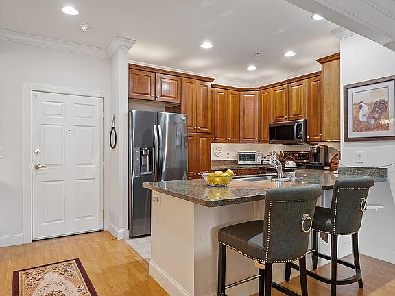 Welcome to the Club at Meadowbrook Condominiums. This 4th floor END unit is situated in building #3. Come experience the peaceful setting and surroundings around the club house, cupola and water fountain. This well maintained unit has inside parking garage spot #4, and visitor parking outdoors,and,elevators. Unit features one floor living with a beautiful cherry kitchen with granite tops and all newer stainless appliances. Hardwood flooring, living room has lots of natural light and a beautiful raised fireplace, Large primary bedroom with extra window, large closet and private bath with soaking tub and shower.. Second bedroom can be used for guests, office, or den and has easy access to the main bath. All closets are generous in size. Additional indoor storage is right down the hall next to this unit for excess belongings. The Club at Meadowbrook offers clubhouse facility with exercise area, recreational activities, and gathering spaces indoor and out. The location feature walking distance to Ingram Senior Center , minutes to Rte 93, the Rockingham Mall and Tuscan Village. Schedule your visit today. Showings start Thursday 8/31/23.
