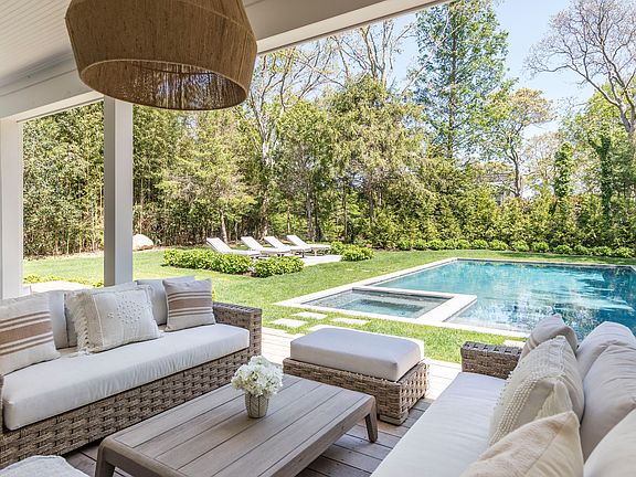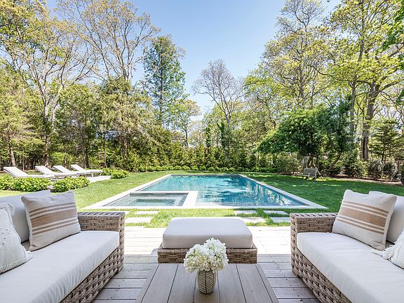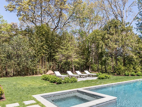 Rental Registration #: RR- 25-529 Discover the epitome of summer living in this fabulous, newly constructed home, ideally situated just one block from East Hampton's most beautiful and swimmable bay beach in the Northwest. Spanning 6,000 square feet over three impeccably finished levels, this modern farmhouse-style residence offers 6 bedrooms and 7 full baths, providing ample space for a memorable summer season. The ground floor welcomes you with its impressive double-height cathedral ceilings and a marble surround gas fireplace, creating an airy, bright, and inviting atmosphere. The gourmet kitchen is a chef's delight, featuring a massive center island with seating for five, elegantly wrapped in exquisite leathered quartzite countertops, offering generous prep space for all to participate. Top-of-the-line Thermador appliances include a 6-burner double oven range with a griddle (oh yes!), two dishwashers, an ice maker, a built-in microwave, and a refrigerator with dedicated wine storage. Adjacent to the kitchen, the dining area has a table for ten and offers scenic views of the property with French doors to a spacious covered back patio with a fireplace, an outdoor dining table for ten, and plenty of seating areas where all-day lounging overlooks the pool. Also, on the ground floor, you'll find an ensuite queen bedroom and a honed marble full bath near the mudroom, providing convenient backyard access and a stylish pool bath. Upstairs, you'll find three spacious ensuite king bedrooms (2 primary suites) with large closets. The primary suite features a long private outdoor terrace with peekaboo water views overlooking the pool and beautifully manicured property. The lower level is designed for relaxation and entertainment, boasting an oversized media room, a fully built-in wet bar with a beverage fridge and two refrigerator drawers, a gym, steam shower, and two additional bedrooms, one with a king bed and the other with twin beds. Outside is a charming front porch patio set back from the road behind privacy evergreens. The grounds surrounding the house are a dream, with a 20 x 40' heated salt-water gunite pool and a tanning deck surrounded by a large lawn and beautiful plantings. The evening setting is magical, listening to the sound of the waves from the bay in the backyard under a starry night. The additional features that make this a thoroughly perfect vacation home are two sets of high-capacity washer dryers, Toto toilets, radiant heated floors, and body spray spa baths in both primary bedrooms. All above-ground bedrooms have auto blackout shades, and every counter, floor stone, and tile in the house is natural stone. The kitchen is stocked with counter appliances like an automatic coffee/cappuccino maker, pasta maker, and multiple Insta pots. If you can think of anything, they have it. This East Hampton sanctuary is steps to the wondexcellentmy's Beach preserve with walking trails and the best-kept secret in the Hamptons, which is a pristine bay beach with crystal clear water and a sandy bottom perfect for swimming long laps or having the best day at the beach with young ones. Embrace the opportunity to enjoy the best of coastal living in this exceptional East Hampton home.