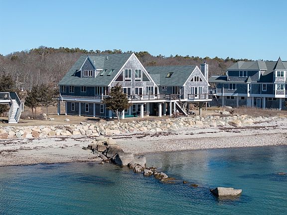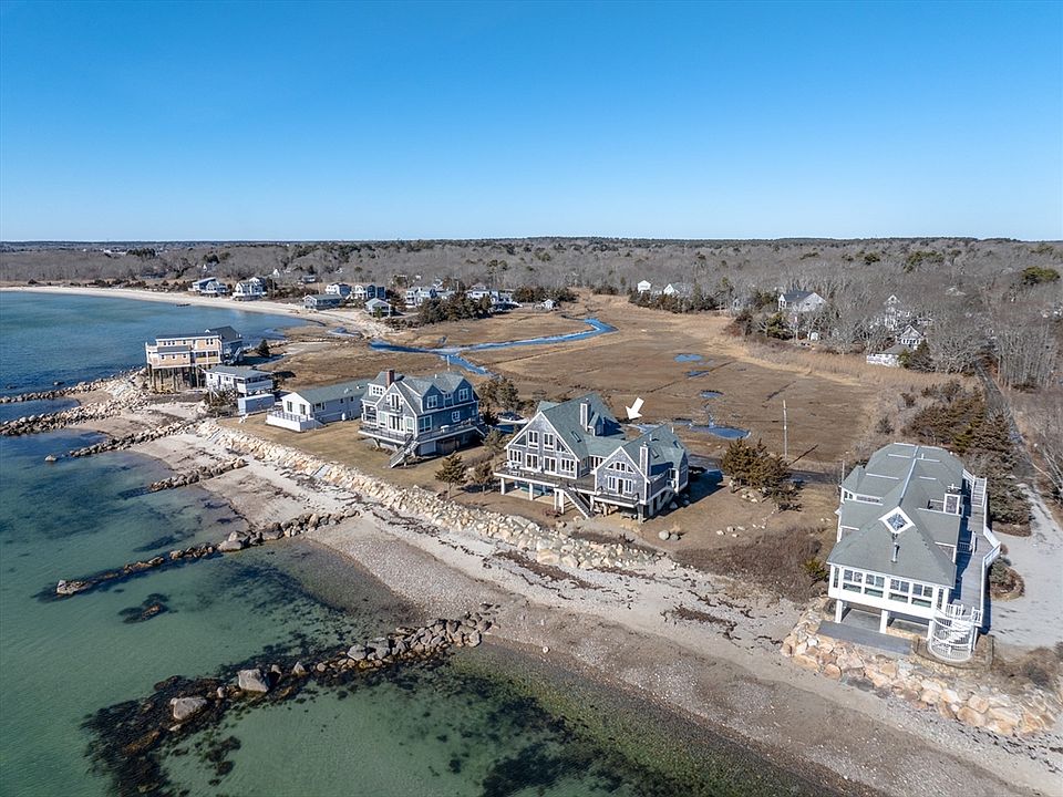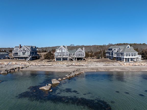 Stunning oceanfront 4-bedroom, 3 full bath contemporary elevated home with its own beach and panoramic water views. Enjoy dramatic sunrises and sunsets over Buzzards Bay and the adjacent marsh from every room inside this home, as well as from the multiple levels of deck space. Swim, kayak, paddle-board or quahog just off your beach. Or relax from any of the gorgeous interior rooms whether it’s the soaring living room and adjoining kitchen with two levels of glass, or the private primary guest suite with ensuite bath, walk-in closet, living area and charming fireplace. There’s a garage that runs the entire length of the house and can accommodate several cars. This property’s large parcel runs from the water to the marsh behind the home and there’s an actual beachfront yard and plenty of ground level entertaining space both under and adjacent to the home.