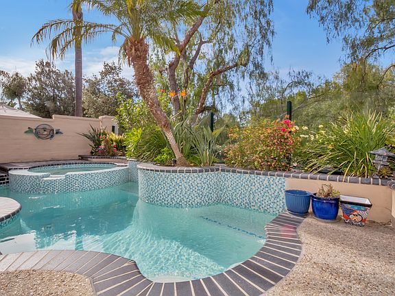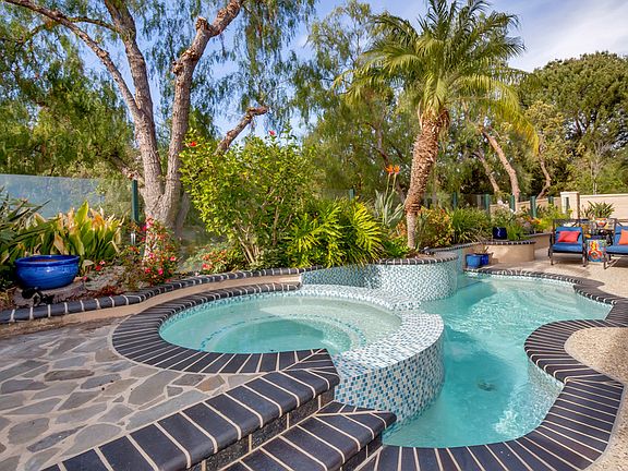 Beautiful home with one bedroom plus office downstairs. Remodeled kitchen has stainless Viking appliances and custom marble counters. Nice, private backyard with pool/spa. 3-car garage.