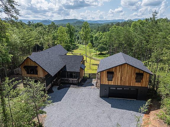 This single-owner masterpiece, completed in 2024, is nestled on a scenic 2.04-acre corner lot with year-round long-range mountain views. Located just 10 minutes from downtown Blue Ridge, the home blends contemporary design with rustic charm for the perfect mountain retreat. A circular driveway welcomes you home with ample space for an RV and additional parking. The oversized 29' x 29' two-car garage features 9-ft ceilings, a utility sink, and a 125-amp sub panel—plus a hidden gem above: a fully equipped 2-bedroom, 1-bath apartment with private entrance and window HVAC. The finished space above includes an open common area (29' x 17') with a vaulted 13-ft ceiling, two 12' x 12' bedrooms with 11-ft vaulted ceilings, and totals 841 sq ft—matching the garage's footprint. Upon entering, you'll discover warm pine walls, gleaming hardwood floors, and large windows that frame sweeping mountain vistas. The open-concept great room is anchored by a striking stone fireplace, perfect for cozy evenings. The chef's kitchen features high-end Viking appliances, including a 6-burner range, granite countertops, and a serving window to the spacious dining area. Off the dining room, a screened-in porch with a second stone fireplace offers a serene space to enjoy fresh mountain air all year long. The main-level primary suite provides a private retreat with a luxurious en suite bath. A laundry room and half bath on the main floor add everyday convenience. Upstairs are three additional bedrooms with inspiring views. The upgraded septic system supports six bedrooms. Outside, enjoy a large fenced backyard and front yard with a children's play area. A Generac whole-house generator ensures backup power. Whether enjoying coffee at sunrise or exploring downtown Blue Ridge, 5 Serenity View offers timeless craftsmanship and modern comfort.