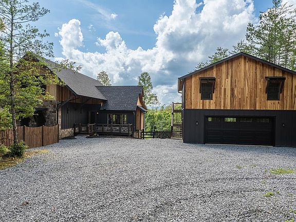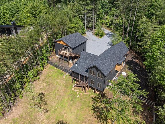 *NOW OFFERED FULLY FURNISHED!* This single-owner masterpiece, completed in 2024, is nestled on a scenic 2.04-acre corner lot with year-round long-range mountain views. Located just 10 minutes from downtown Blue Ridge, the home blends contemporary design with rustic charm for the perfect mountain retreat. A circular driveway welcomes you home with ample space for an RV and additional parking. The oversized 29' x 29' two-car garage features 9-ft ceilings, a utility sink, and a 125-amp sub panel—plus a hidden gem above: a fully equipped 2-bedroom, 1-bath apartment with private entrance and window HVAC. The finished space above includes an open common area (29' x 17') with a vaulted 13-ft ceiling, two 12' x 12' bedrooms with 11-ft vaulted ceilings, and totals 841 sq ft—matching the garage's footprint. Upon entering, you'll discover warm pine walls, gleaming hardwood floors, and large windows that frame sweeping mountain vistas. The open-concept great room is anchored by a striking stone fireplace, perfect for cozy evenings. The chef's kitchen features high-end Viking appliances, including a 6-burner range, granite countertops, and a serving window to the spacious dining area. Off the dining room, a screened-in porch with a second stone fireplace offers a serene space to enjoy fresh mountain air all year long. The main-level primary suite provides a private retreat with a luxurious en suite bath. A laundry room and half bath on the main floor add everyday convenience. Upstairs are three additional bedrooms with inspiring views. The upgraded septic system supports six bedrooms. Outside, enjoy a large fenced backyard and front yard with a children's play area. A Generac whole-house generator ensures backup power. Whether enjoying coffee at sunrise or exploring downtown Blue Ridge, 5 Serenity View offers timeless craftsmanship and modern comfort.