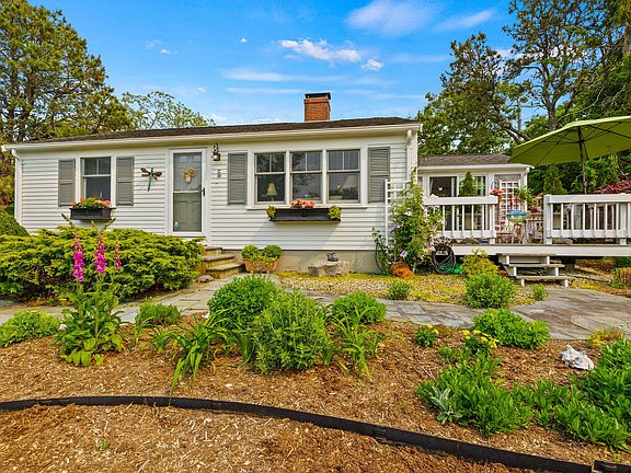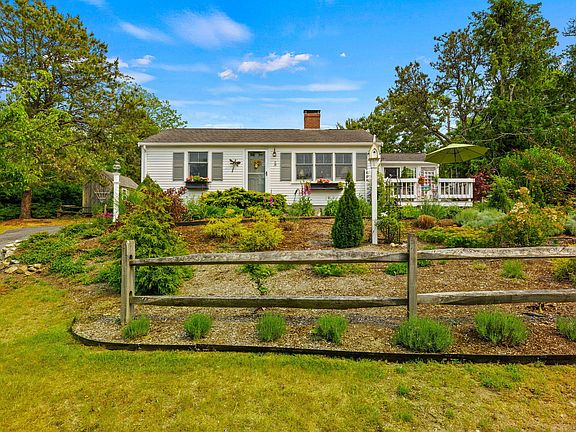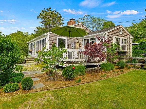 Looking for a home in Harwich that offers proximity to restaurants, shopping, and grocery while remaining conveniently accessible to both Harwich Port and Harwich Center? Look no further-this property boasts the ideal location. If you're a beach lover, you'll be delighted to know that Nantucket Sound beaches are conveniently located. If you're an avid biker, the Cape Cod Rail Trail is just a short distance. This English Cottage home (3 bedrooms septic) has undergone a modification where the third bedroom has been opened up and transformed into a sun filled dining room with access to both the front deck and back patio. Inside the home, you'll find a bright and airy living room that features a wood-burning fireplace, creating a warm and cozy atmosphere. The living room partially opens up to the kitchen and separate dining room, allowing for easy interaction and a sense of spaciousness. The corner lot on this tranquil street is a haven of relaxation, adorned with beautiful gardens and various seating areas enveloped by blooming flowers and lush bushes, plus a fenced in back yard. What's more, the peaceful conservation area across the street ensures that you won't be disturbed.