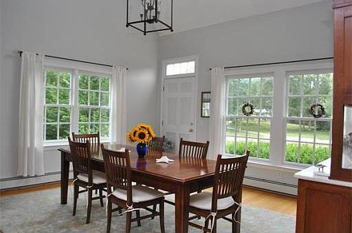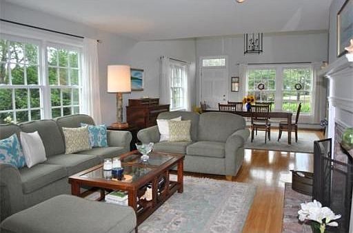 This outstanding shingle style home is quietly elegant and has been lovingly maintained. Located on a country lane just off of Smith Neck Road, the house is set back and has tremendous curb appeal. Stone walls, lush lawns and flowering perennials abound. An airy open floor plan features an updated kitchen with dining area and wood-burning stove that leads to a formal dining room with soaring ceilings and walls of windows. The fireplaced living room is open to the dining room with hardwood floors, built-ins and French doors that lead to a canopied deck overlooking the backyard. A full bath, den and office, as well as laundry room complete the first level. The second level offers a spacious and bright master suite as well as three additional bedrooms and another full bath. Additionally there is a detached two-car garage with loft space for storage. Heating, AC and windows have all been replaced within the last two years.