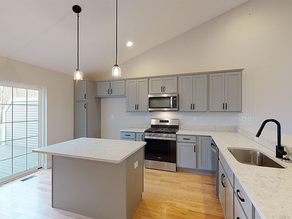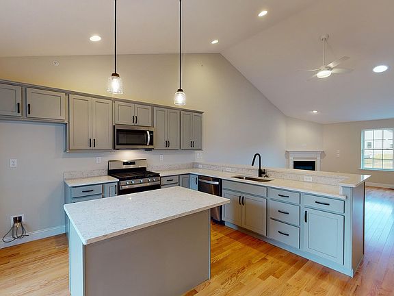 The Magnolia interior ranch at Winchester Heights features 1,654 square feet of living space on the main level with the option to finish the lower level. Highlights of this 2 bedroom, 2 bath home include an open concept layout with cathedral ceilings, fireplaced living room, sliders leading to a generous care-free deck, hardwood & luxury vinyl tile on the main level, and a 2-car garage. The kitchen features Kemper Antrim cabinets in grey, along with beautiful quartz countertops, satin nickel handles and pulls, and stainless steel appliances.