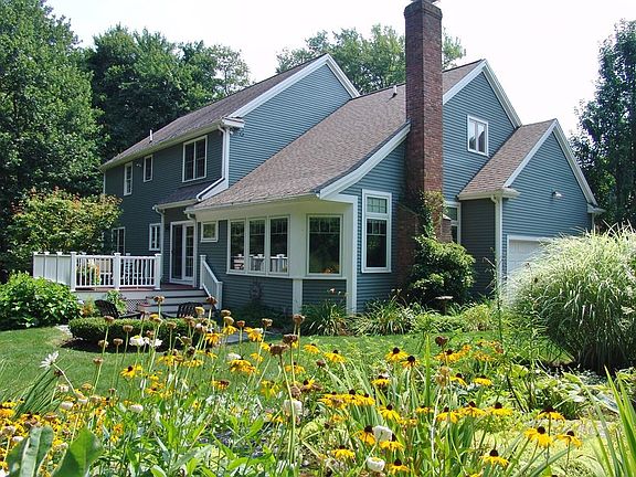 Beautiful Colonial quietly nestled in desirable cul-de-sac close to the Center of Town. Set on Very Private 1.6 acre estate-like property that runs seamlessly into 12 acres of wooded conservation land. This home features a NEW deck + blue stone patio where you can enjoy the "Zen-like Waterfall" enhanced by well-established perennials and a thoughtfully planned "Butterfly Garden". This view carries inside the sun filled step down Family Rm w/ its wood burning fireplace, custom mantle, built-in cabinets, cork flooring, Bose surround w/ flat screen TV. Eat in Kitchen w/ NEW stainless appliances, NEW granite countertops, custom cabinets, buffet+center island. DR w/ cherry inlay, spacious LR, 1st Floor Laundry, Bath + Office. 4 Large BRs, 3 w/ NEW Carpet, Master BR w/ Brazilian Cherry. Designer Mahogany Front Porch, Paver Walk, Prof. Landscaped, NEW A/C Compressors '13, NEW Burner '14, De-Ice Cables, NEW Driveway, Sec System, Walkout Basement,*TOWN WATER + TOWN SEWER*.
