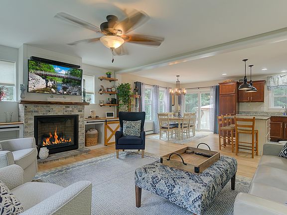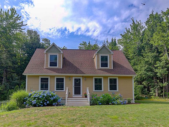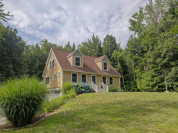 Welcome to The Moats, a lovely neighborhood of high-end homes in low-tax Albany, where this meticulously maintained classic Cape-style home is situated. Tucked back through the trees on a large 2.5 acre corner lot, this home enjoys plenty of peace and privacy all around. The paved driveway leads to a heated 2-car garage underneath the home, or follow the stone steps through the beautiful mature landscaping and bright blue hydrangeas to the front entryway. The main floor has an open concept layout with an eat-in kitchen equipped with newer stainless appliances, granite countertops, and newly refinished hardwood floors. Oversized windows let in tons of natural light, and the living room stays cozy with a gas fireplace fronted with stone tile, a live edge wood mantel, and custom built-in cabinetry. Sliders lead out to the patio area for grilling and dining in the summer. Rounding out the main level are a 3/4 bathroom, den with closet, and a large first floor bedroom with double closets. Upstairs, there are two huge bedrooms with hardwood floors and sliding barn door accents, a large bathroom with a tile and glass shower plus a double vanity. Outside is the backyard oasis! There's space for gardening, a large shed, a patio area with room for a fire pit, space for seating, and a bark mulch yard for easier maintenance. Enjoy easy access to a multitude of hiking trails along the scenic Kancamagus Highway, or walk to the Swift River for a swim.