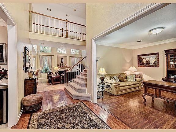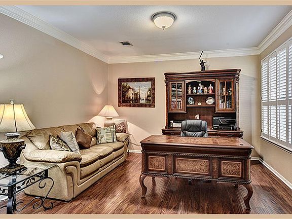 Updated LifeForms home on a cul-de-sac, corner lot in Cochran's Crossing! Two story entry, Plantation shutters, crown moulding, neutral paint colors, hardwood & tile floors. Island kitchen w/bkfast bar, granite counters & SS appls opens to bkfast rm & den w/gas fireplace; formal dining w/chair rail; private study; master retreat down; 3 generous bedrooms & gamerm up; covered patio & lanai overlooks beautiful pool w/rock waterfall surrounded by mature trees.