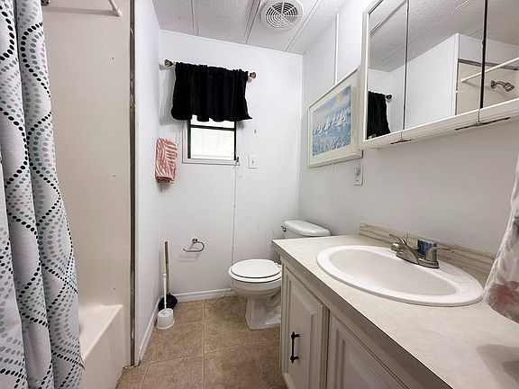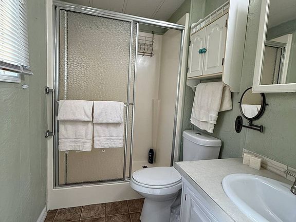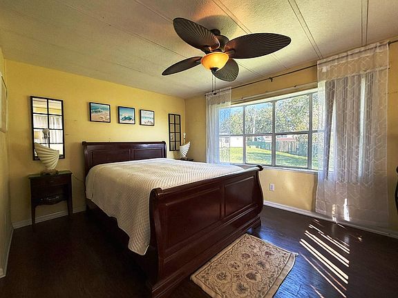 Welcome to this spacious and beautifully designed home, perfectly situated on a private lot with no neighbors right on top of you. There's an abundance of room inside and out, making it an ideal retreat. As you step in, you're greeted by a thoughtfully designed kitchen with a curved breakfast bar, plenty of cabinetry, and a stylish backsplash. Natural light pours in through the windows, highlighting the pendant lighting and upgraded finishes. The flooring is a mix of wood laminate, ceramic tile, and wood accents throughout, giving each space its own charm. The kitchen connects to a generous dining area with a built-in hutch, perfect for a coffee bar or display space. Large windows flood the dining and living areas with light, creating a bright, airy feel. The living room is expansive, with comfortable seating and an open flow into both the dining and kitchen areas, ideal for entertaining. Off the living space is a cozy Florida room with windows, screens, and indoor-outdoor carpeting, offering a relaxing spot to enjoy the Florida breeze. On the other side of the home, a second screened lanai stretches from the front carport all the way to the back, with a paved sitting area and easy access to the shed that houses your washer and dryer. The guest bedroom is spacious, fitting a queen bed with plenty of room left for nightstands, dressers, or even a desk. It has a nice-sized closet and sits conveniently across from the guest bath, which features a tub-and-shower combo, a vanity with storage, ceramic tile, and a window for natural light. The master suite is a true retreat, bright, oversized, and ready for a king-sized bed with additional furnishings. It offers a large walk-in closet and an en suite bath with a shower insert and durable vinyl flooring. This home comes fully turnkey, everything you see stays. It's located just steps away from one of the community's six heated pools, giving you easy access to resort-style living. With its private lot, multiple living and entertaining areas, and loads of natural light, this is a home you'll love coming back to every day. Colony Cove is a premier 55+ resort-style manufactured home community offering five clubhouses, six heated pools, a riverfront pavilion, private marina, fishing pier, dog park, fitness centers, pickleball, tennis, and daily planned activities. Residents enjoy an active, social lifestyle in a secure, pet-friendly environment. Lot rent varies by location and includes lawn care, property taxes, and full access to all amenities-leaving only electricity and internet as additional expenses. While information is deemed reliable, independent home inspections are recommended. Lot rent is set by the community office. Colony Cove delivers comfort, convenience, and community in one of Florida's most desirable retirement settings.