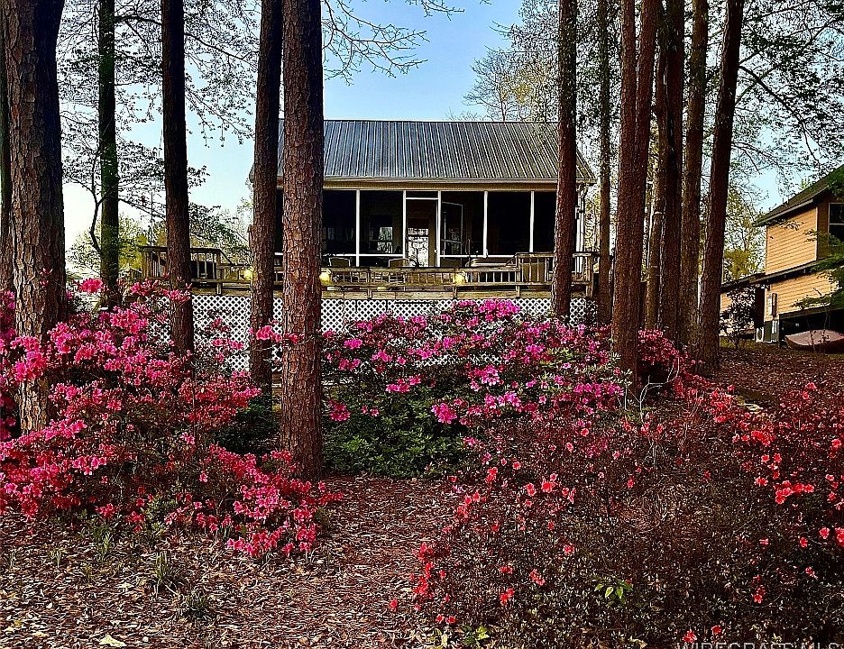 LAKE FRONT! Spectacular 3 bedroom 2 bathroom home with an open floor plan consisting of living room, dining room and kitchen. Screened in Porch, Large deck with 7 person hot tub. Lakeside Firepit with 6 Adirondack chairs. Living room boasts a ventless fireplace for those cool evenings by the lake. Primary ensuite includes walk-in shower. Oversized garage with sink area and plenty of storage/closet. Attic is partially decked with pull downstairs for easy attic access. You will appreciate the wooden walkway all the way down to the water, wide enough for a golf cart and a turn-around area at the dock. Covered boat dock with lift. Owner has provided a list of the upgrades and custom touches. Come enjoy boating, fishing, tubing and making lots of memories. The lot is meticulously Landscaped to accentuate the views of the lake. New in 2021 -Windows, Kitchen appliances, Granite countertops, Kitchen sink, All faucets, Light fixtures and ceiling fans. New in 2022 -HVAC. New in 2024 -Door Hardware, Wooden path, walkway and dock replaced and painted. New in 2025 -Additional Septic tank, pump and field lines, New hot water heater, All roof screws replaced, Metal Roof is 2002, except 2018 west side of garage. Items that will convey-Refrigerator and Upright Freezer in garage, small drink refrigerator, washer and dryer,2 bunk beds with bedding,75" TV,2 wooden cabinets (bar and tv), Indoor Dining table with four chairs, Outdoor furniture, hot tub with cover and supplies, Fire pit and 6 Adirondack chairs, Bench swing and 3 outdoor storage boxes.