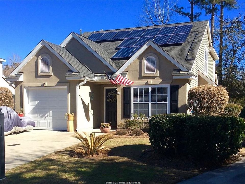 Home is located on a Premium oversized lagoon lot on a cul-de-sac, beautiful trees and landscaping (120 ft deep and 100 ft wide) Entire home has been updated with new carpet, paint, SS appliances, ceiling fans, screens. All interior and exterior trim painted. Home has Solar Roof Panels, which has made a dramatic cost reduction in electricity. 3 bedrooms with 2 and 1/2 baths. Large master suite on first floor. Open and Airy Floor Plan. Amenities include: community pool, pavilion, playground, tennis and basketball courts and fitness center. Walking distance to Schools. HH Beaches 15 minutes away
